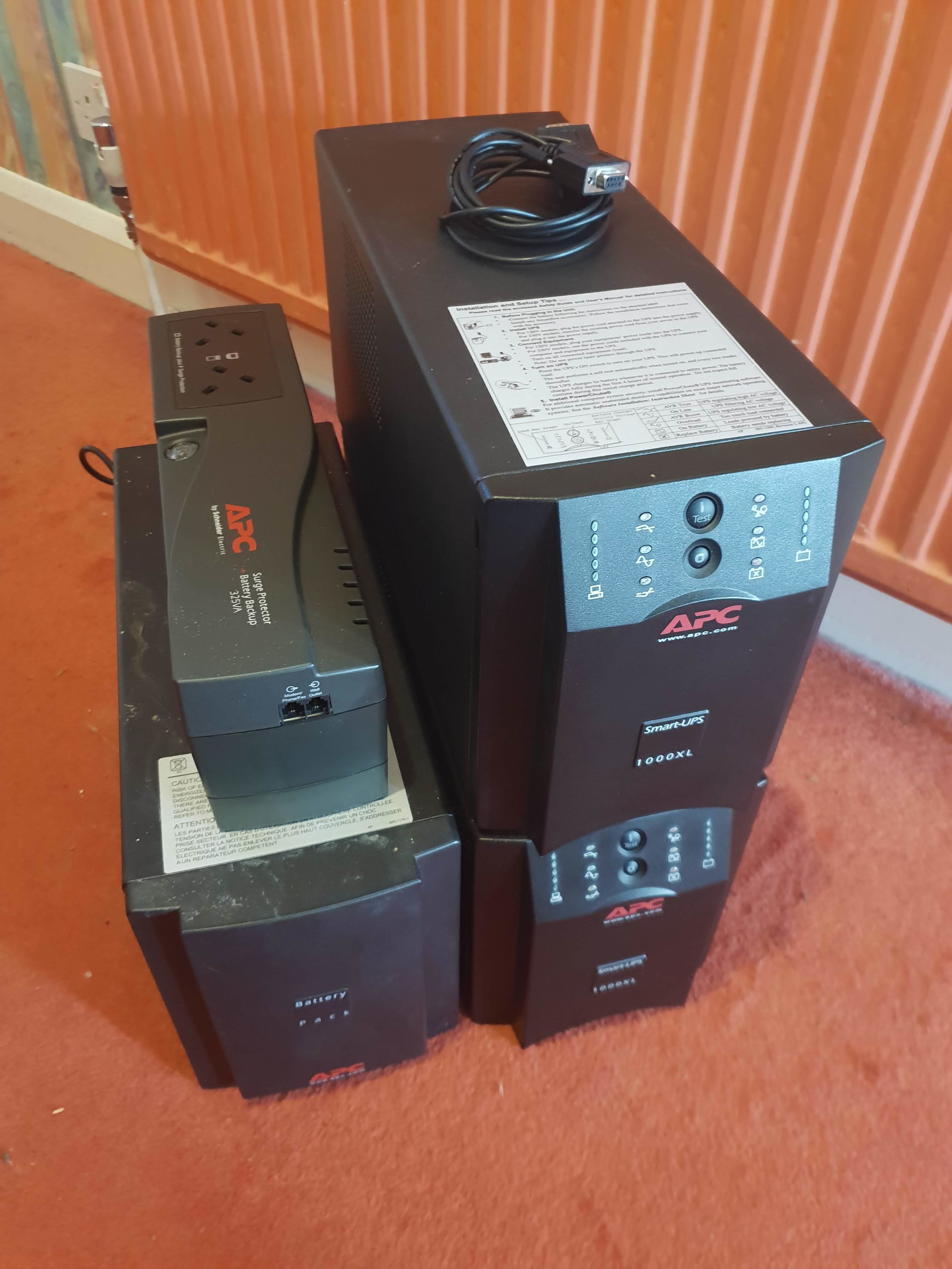That evening after work, the UPS's were loaded up into the boot and took a trip to their new home. I had a look at the pile once it was in from the cold that is a British winter, and found I'd scored a pair of battery-less "Smart-UPS 1000xl" units, an expansion unit for said UPS's, alongside a smaller "Surge Protector + Battery backup 325 VA". Next to the UPS's themselves were a pile of cells and cables which I took at the same time, and to my luck turned up, with the right size cells for the 1000xl units, and the expansion unit.